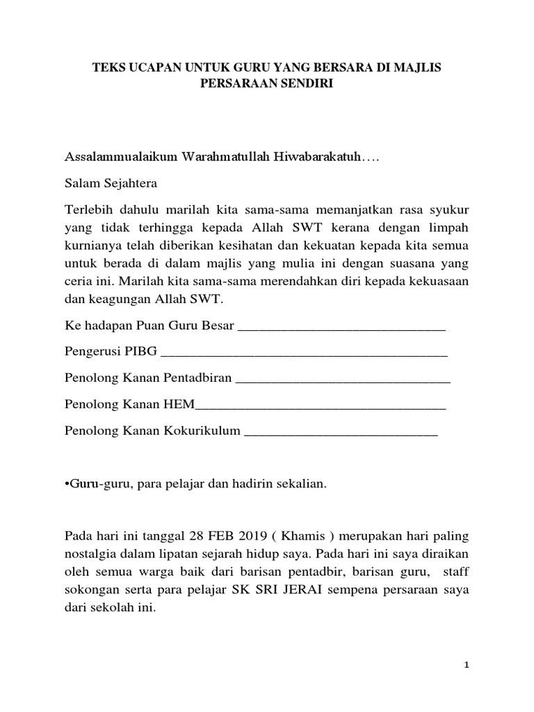 Teks ucapan majlis perpisahan persaraan. Karangan ini juga perlu menyatakan tajuk ucapan/syarahan/ ceramah yang ingin disampaikan. Contohnya, jikalau seoarang pengetua atau guru besar, cara pnggilannya adalah yang berusaha. Ucapan pengetua (noraza) khabar sudah bendang ke langit ucapan perpisahan daripada persaraan kaunselor (baca profil encik khairudin abu hasan: Teks ucapan persaraan tn hj badaruddin hj dahlan.