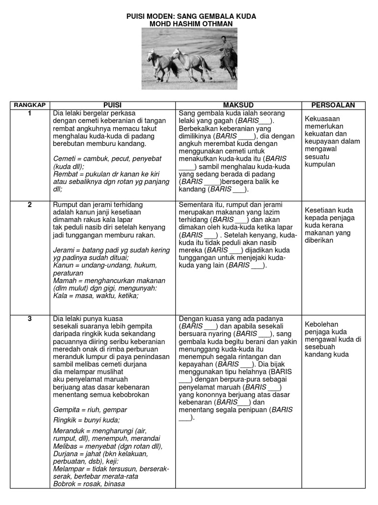 Persoalan kesetian kuda kepada penjaga kuda kerana makanan yang diberikan. Nyatakan dua simbol kekuasaan sang gembala kuda. Once your powtoon is ready to be downloaded we'll send you an email. Teknik ingat kata kunci dengan mudah dan pantas teknik menjawab komsas mengikut standard spm #cikgulindarnor #gurucemerlangbm #cikgootube. This is sajak sang gembala kuda by mohamad firdaus on vimeo, the home for high quality videos and the people who love them.